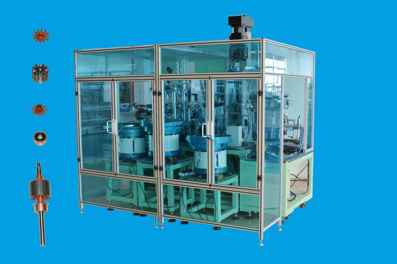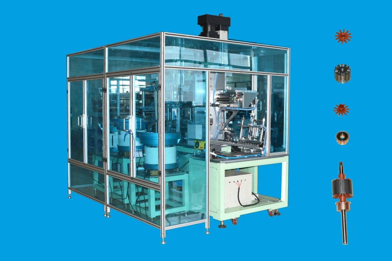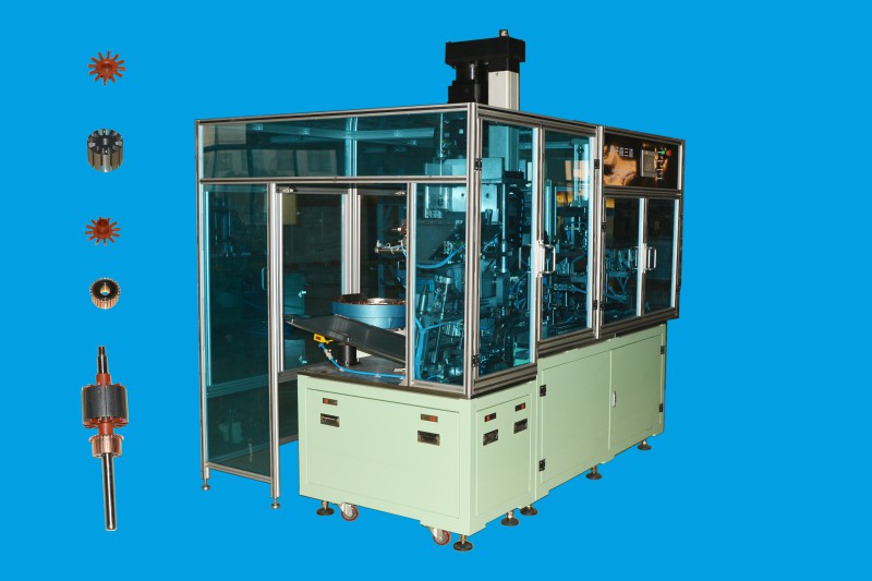 設備介紹: 1、外形尺寸為長寬高=2.3m*1.5m*1.8m,節拍12s/個 2、設備采用機械手抓取傳送方式,整機只需一人半小時左右上一次料,下料和插紙機連接,機械手直接把組裝完成的轉子放到插紙機上插紙即可。 3、工人循環上料鐵芯、轉軸、端板、換向器,一個小時左右上一次料 設備優勢: 1、該設備高效、可靠、穩定,實際產能3500個-4000個/11小時,可節省80%的生產作業人員,優質品率達到99.5%以上 2、整機可以和插紙機聯機,或者加配轉子下料機,直接把組裝好的轉子放到下料機上的托盤上面,裝滿之后由工人拿走,一人可以看3臺機 適用范圍: 適用于串激電機、直流電機(高壓)電動工具,汽車電機等電機上的轉子